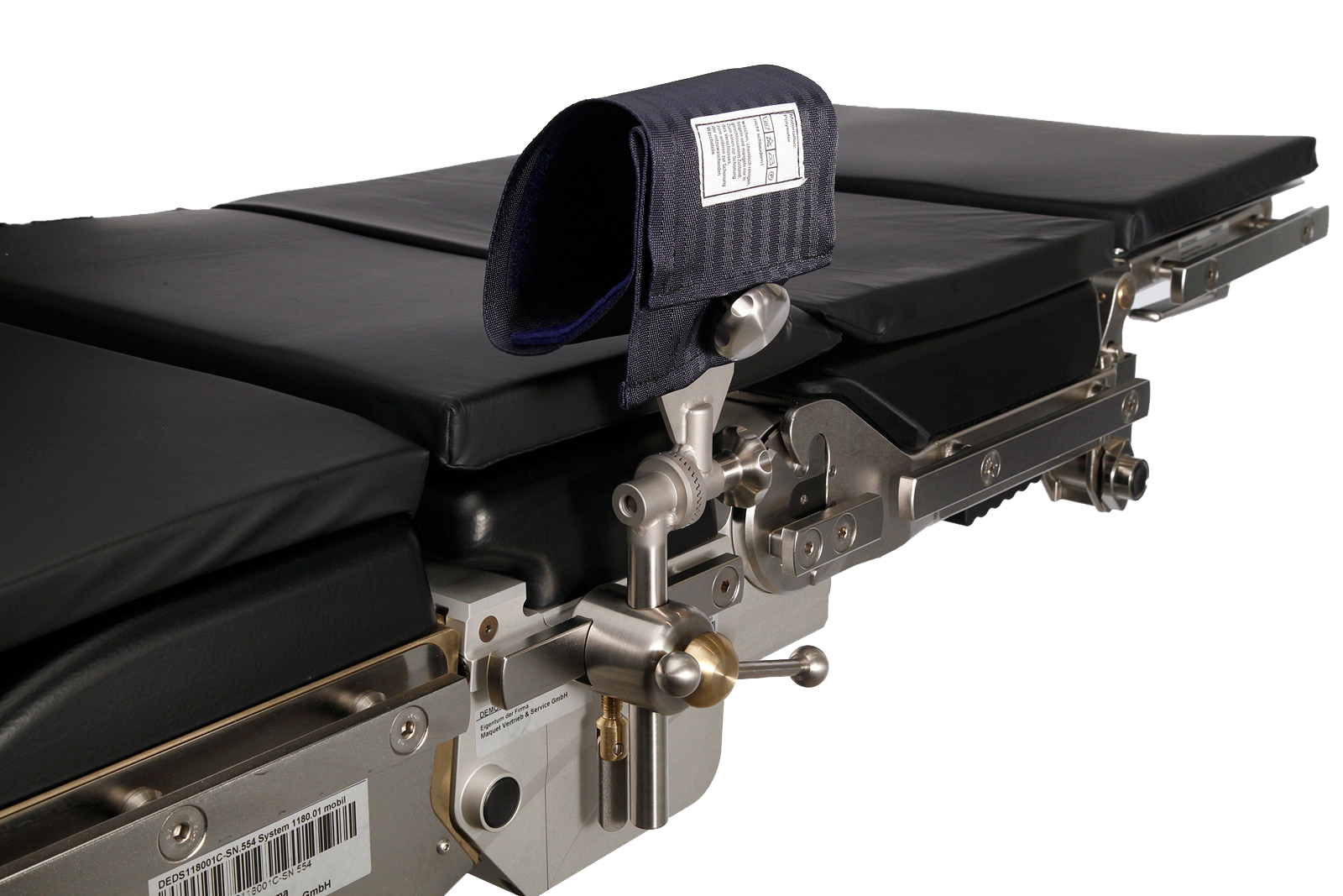 zweiteilige Konstruktion (Kloben sowie Handfessel mit Einsteckstange) ermöglicht eine einfache Anbringung auch bei geringem Abstand der OP-Tisch-Gleitschiene zum Lagerflächenholm