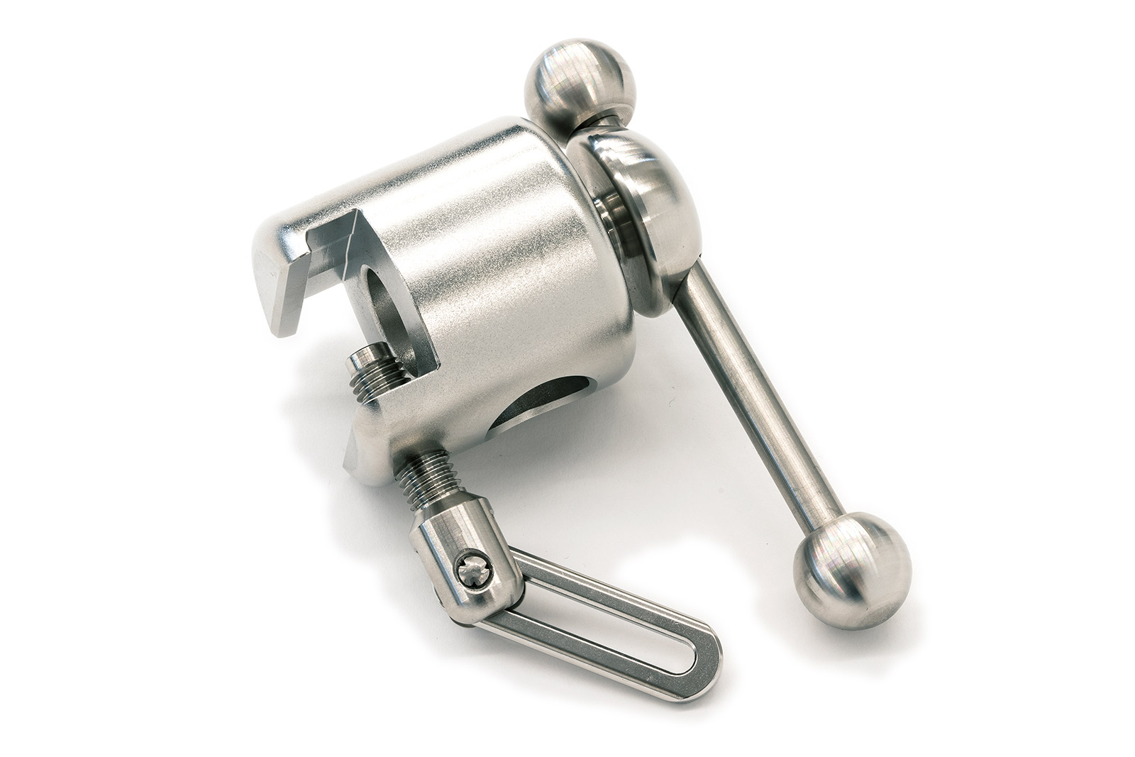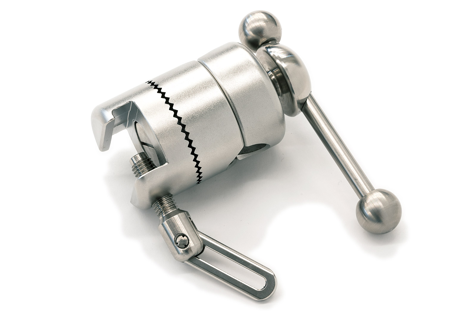 zur Befestigung von OP-Tisch-Zubehör mit Stangendurchmesser 16-18 mm (z.B. Beinhalter, Narkosebogen) an den seitlichen OP-Tisch-Gleitschienen